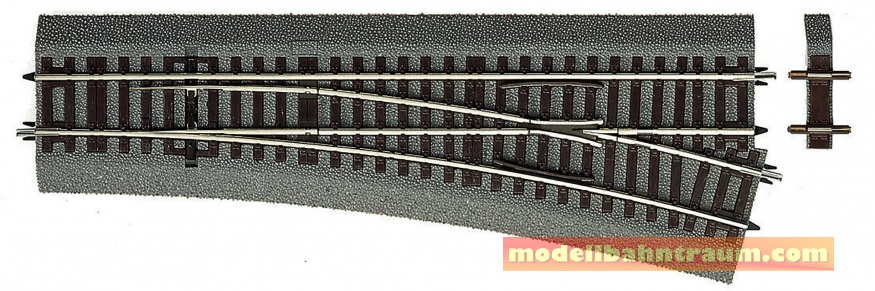 Weiche rechts Wr15, Ausführung wie Art.-Nr. 42539, jedoch Polarisierung vorinstalliert, mit Bettung. Für den Diagonaleinbau liegt ein 8-mm-Distanzstück (D8) bei. Passender Elektro-Antrieb: 42620 oder 42624.