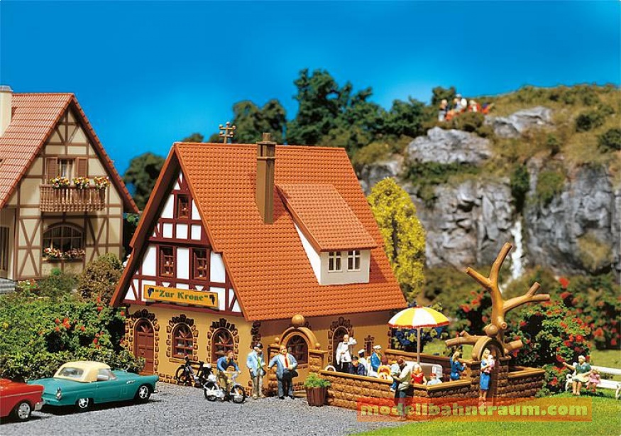 Faller 130314 - Gasthaus Zur Krone Spur: H0 Kleines Gasthaus mit angebautem Biergarten. 42 Einzelteile in 8 Farben, Fensterfolie, 1 Gardinenmaske und 1 Bauanleitung. Faller empiehlt: Plastikkleber.