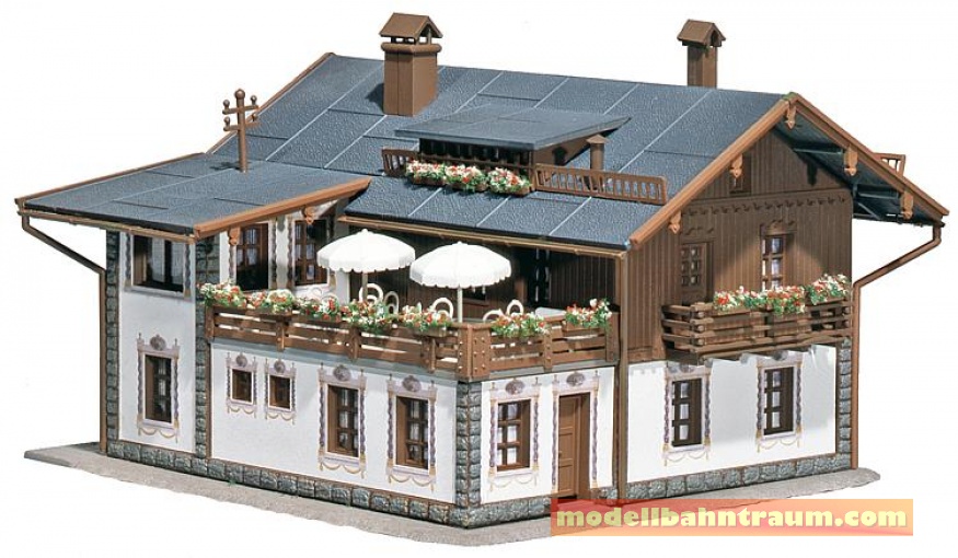 Mit aufwändig gestalteter, mehrseitiger »Lüftlmalerei«-Bedruckung und einer Freiterrasse im ersten Stock. Tische, Bänke und Sonnenschirme liegen bei.