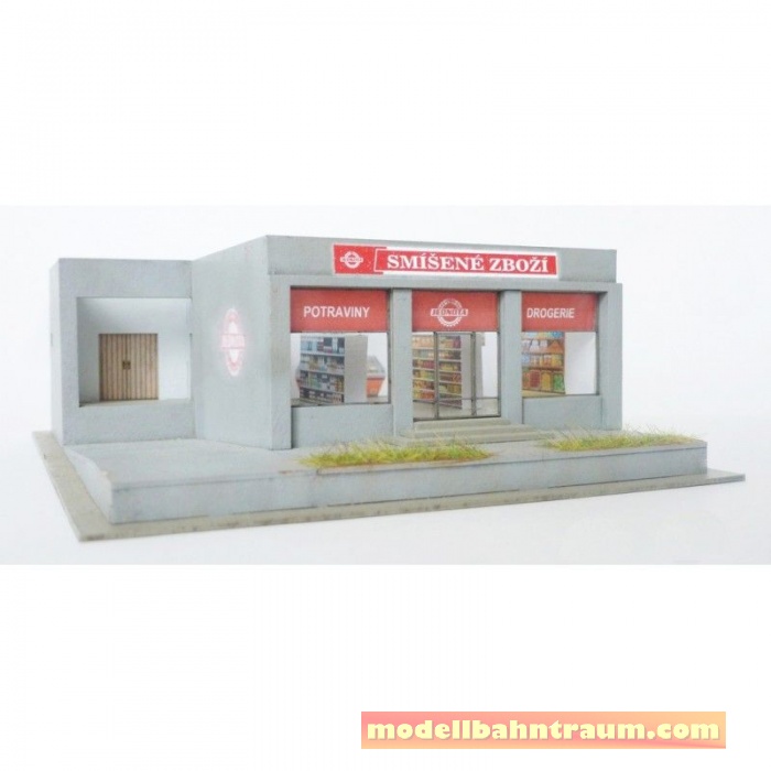 Die Wände sind mit dem Aufdruck geliefert und der Innenraum ist auf einem separaten Papier beigelegt, wie Sie es dem Illustrationsfoto entnehmen können. Der Bestandteil der Packung ist auch ein Modell eines kleinen Autos. Zurzeit ist der Baukasten in dem Maßstab H0 und TT verfügbar.