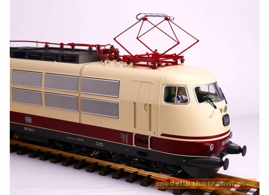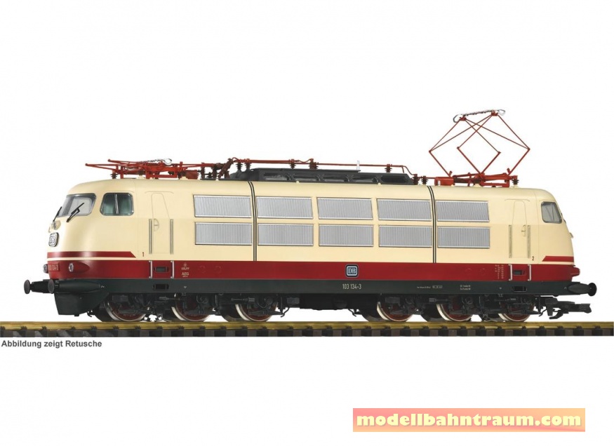 Mit der Formneuheit der Kultlok für den TEE und IC Dienst der DB in der Ursprungsausführung mit Schürze und Scherenstromabnehmer, rot/beiger Lackierung in der kurzen Ausführung erfüllt PIKO einen großen Herzenswunsch vieler Gartenbahner und Liebhaber attraktiver Lokomotiven. Als erstes Modell dieser Baureihe in Baugröße G zeichnet sich die BR 103 durch eine Nachbildung sämtlicher äußerer Erscheinungsmerkmale ihres großen Vorbilds auf. Das fein lackierte und bedruckte Modell überzeugt durch höchste Zuverlässigkeit, Robustheit, kugelgelagerte, verchromte Radsätzen, fahrtrichtungsabhängigen Lichtwechsel sowie eine Führerstandseinrichtung mit Lokführer. Weiter hervorzuheben sind die vielen einzeln angesetzten Details wie Griffstangen und die markanten Scheibenwischer. Die BR 103 von PIKO besitzt darüber hinaus eine hohe Zugkraft und ausgezeichnete Fahreigenschaften. Das Modell ist für Digitalbetrieb mit Soundimitation vorbereitet. Eine Maschinenraum- und Führerstandsbeleuchtung kann problemlos nachgerüstet werden.