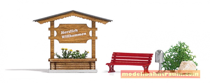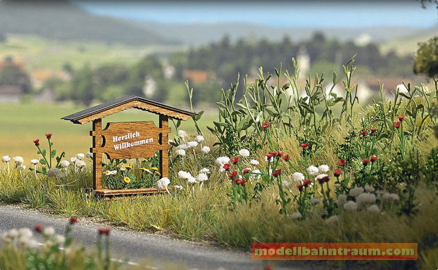 Ländliches Ortseingangsschild aus Holz mit Überdachung und Blumenkasten. Beidseitige Bedruckung des Schildes zur Begrüßung »Herzlich Willkommen« und Verabschiedung »Auf Wiedersehen. Gute Fahrt«.