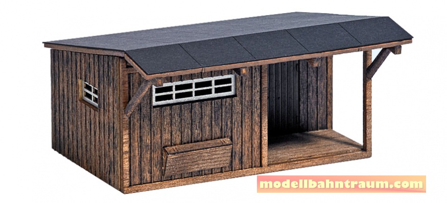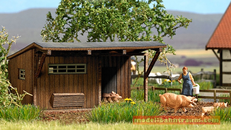 Typischer Schweinestall in Echt-Holz-Bauweise, alle Teile fertig koloriert. Der Dachüberhang an der Vorderseite gewährt die witterungsgeschützte Futteraufnahme am Trog. Seitlicher Eingang mit Holzboden, der von den