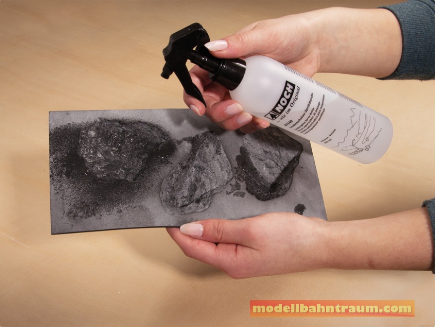 Anwendung 2 »Fixieren«: Bringen Sie das zu fixierende Material (Geröll, Schotter, Flock o.a.) lose auf und sprühen Sie es anschließend mit Landschaftsbau-Sprühleim ein. Nach dem Trocknen können weitere Schichten aufgestreut und fixiert werden um mehr Volumen zu erzielen.