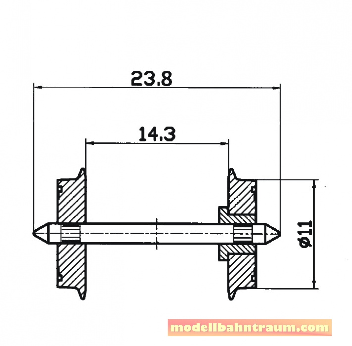 H0-Normradsatz für Gleichstrom, einseitig isoliert. Raddurchmesser: 11 mm. Achslänge: 23,8 mm. Inhalt: 2 Stück/Packung.