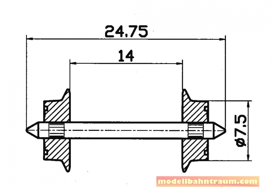 Wechselstrom-Radsatz. Raddurchmesser: 7,5 mm. Achslänge: 24,75 mm. Inhalt: 2 Stück/Packung.