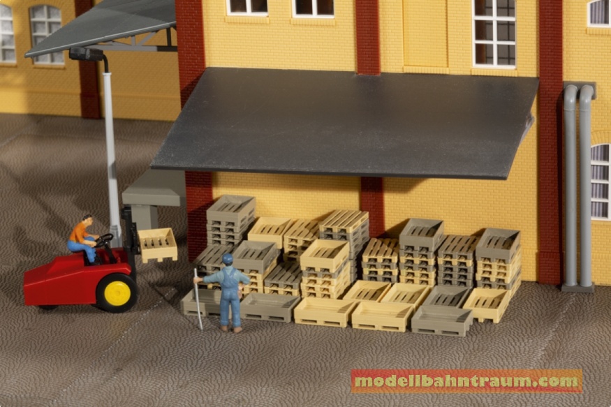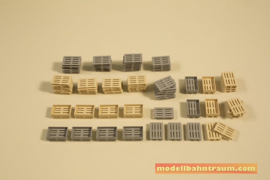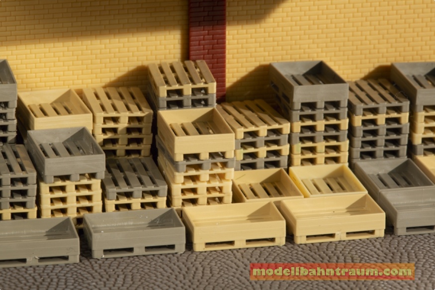 Mit den Europaletten lassen sich Fahrzeuge beladen, Ladeszenen darstellen oder große Palettenlager gestalten. In einer Packung sind 80 „normale Paletten und 16 Paletten mit Aufsatzrahmen in je zwei verschiedenen Versionen (neue und gebrauchte Paletten).