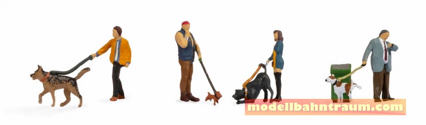 Das Figuren-Set beinhaltet 4 Figuren mit 4 Hunden. Außerdem ist in dem Set ein grüner Mülleimer mit grauem Deckel für das Geschäft der Hunde enthalten. Es ist wichtig, dieses immer ordnungsgemäß von den Herrchen zu entsorgen, damit die anderen Passanten sich nicht ärgern müssen. Einer der Figuren trägt eine schwarze Hose, braune Schuhe und eine orangene Jacke. An der Leine hat er einen Schäferhund. Eine Frau mit blauem Kleid und langen Stiefeln ist mit ihrem schwarzen Hund, der an der braunen Leine zieht, unterwegs. Der Mann im hellblauen Sakko, unter dem er ein weißes Hemd mit einer schwarzen Krawatte trägt schaut auf seinen Uhr während sein weiß-brauner Hund an der Leine geduldig wartet. Der Mann mit einem braunen Dackel an der schwarzen Leine macht das Figuren-Set perfekt. Er trägt eine dunkelbraune Hose, schwarze Schuhe, sowie eine ärmellose blaue Jacke. Er ist sehr muskulös und trägt ein orangenes Tuch auf seinem Kopf.