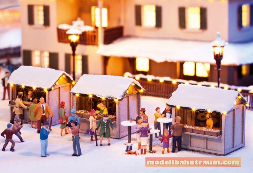 Der Bausatz besteht aus drei typischen, laser-geschnittenen Buden, die Atmosphäre in jede Winterszene bringen. Inklusive Bauanleitung und Spezialkleber.