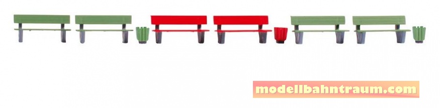 Inhalt: 4 Bänke grün, 2 Bänke rot, 3 Papierkörbe