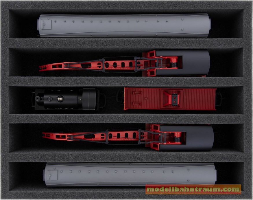 Mehrere Züge und Wagen können nebeneinander in einem Fach untergebracht werden. Um ein Aneinanderstoßen oder ungewolltes Ankuppeln zu verhindern, bieten wir passende Schaumstoff-Distanzstücke (HS040A002, HS020A001) an.