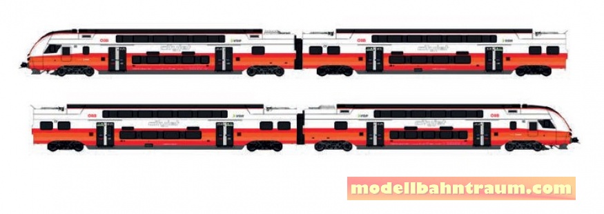 4-teilige Zuggarnitur im ÖBB Cityjet Design mit einem angetriebenen Wagen, stromführende Kupplung, Lichtwechsel, Fernlicht, Innenbeleuchtung und beleuchteten Zugzielanzeigen.