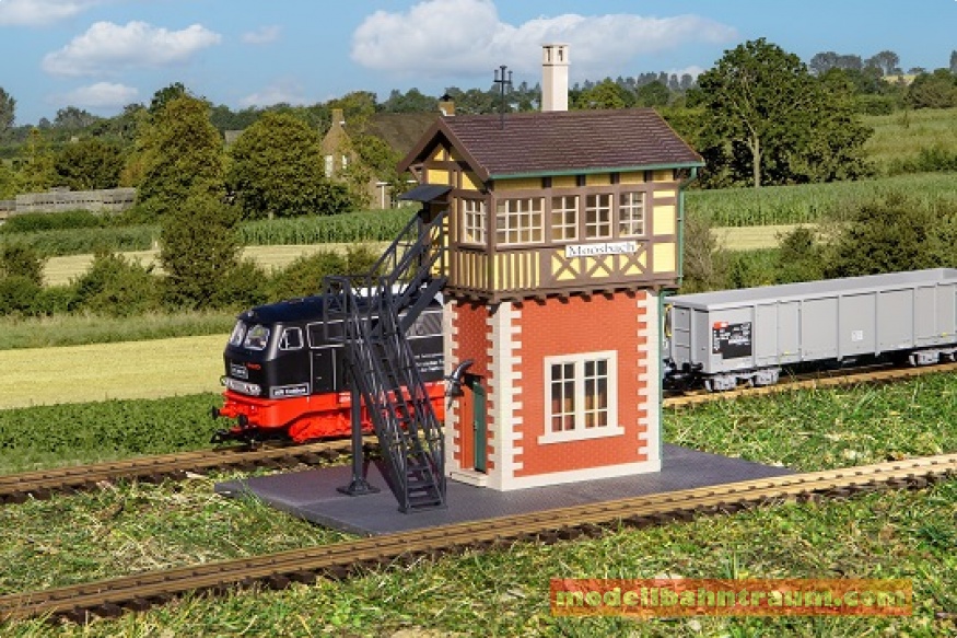 Neuheit 2025: Mit farbenfrohem Ziegel-Fachwerk, fein gearbeiteter Treppe und historischem Charme bringt dieses Stellwerk das Flair vergangener Bahnzeiten in den Garten – ein liebevoll gestaltetes Detail für authentische Szenen am Gleis.