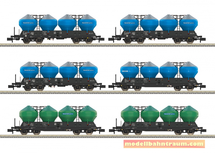 Vorbild: 6 vierachsige Silowagen der Bauart Uacs der Bahngesellschaft TRANSPORTSERVIS a.s. in Tschechien. 3 Silowagen in der Ausführung mit geradem Langträger und 3 Silowagen in der Ausführung mit "Schürze". 4 Wagen mit blauen und 2 Wagen mit grünen Behältern. Betriebszustand um 2011.