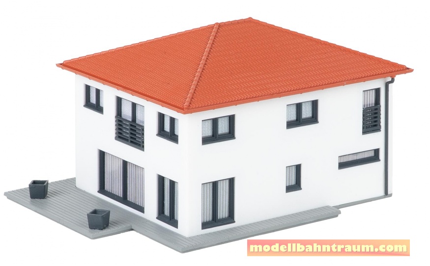 Ein Modell-Haus in modernem, schlichtem Design mit weißer Fassade, warmem orangenem Ziegeldach und markanten schwarzen Fensterrahmen. Hervorragend geeignet, um eine moderne Vorstadt oder eine luxuriöse Wohngegend auszugestalten.