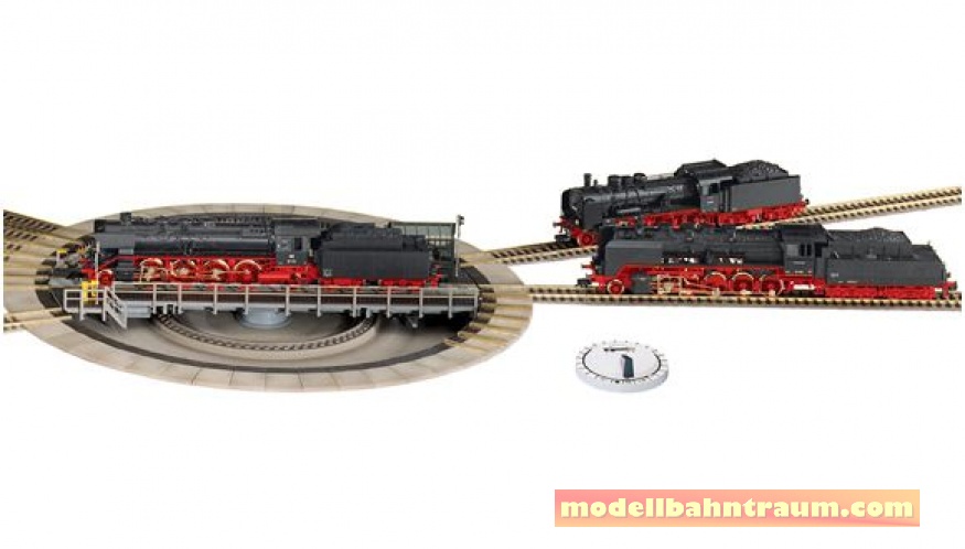 Die Drehscheibe ist in vorbildgetreuer Gruben-Bauweise und in vorbildlicher Darstellung sämtlicher Einzelheiten gefertigt. Die Grundausstattung der Drehscheibe besteht aus 6 Auffahrgleisen und 4 Blindstutzen. Die Auffahrgleise können im Winkel von 7,5° beliebig in Anzahl und Anordnung umgesteckt werden und durch Drehscheiben-Ergänzungs-Sets 6153 auf bis zu insgesamt 48 Gleisanschlüsse erweitert werden.