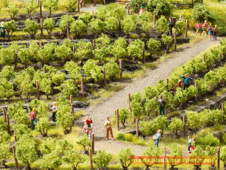 Enthalten sind sechs Reihen mit je vier Rebstöcken. Die Blätter der Reben werden aus dem bekannten hochwertigen NOCH Blattwerk gestaltet.