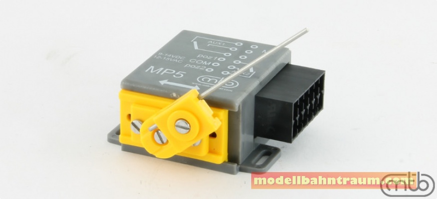 Der Hub wird in drei Stufen 3, 6, 9 und 12 mm eingestellt – siehe Zeichnung. Der Kulissenmechanismus sichert ununterbrochen Reichweite in die Endposition und ihr Arretiereinrichtung. Die Spannungsversorgung ist Gleich- und Wechselstrom 8–16 V, Stromaufnahme ca. 150 mA beim Lauf. Der Mechanismus ist mit Endlagenschaltern ausgestattet, d.h. Steuerungsspannung kann dauerhaft angeschlossen sein, nach dem Erreichen der betreffenden Lage werden die Stromaufnahme und die Bewegung automatisch getrennt. MP5 ist leicht ohne Änderung der Modellbahnanlage anzubringen. Kompatibel mit herkömmlichen DCC–Dekoder wie z.B. Lenz LS100, LS150, usw. Weichenantrieb ist mit zwei Wechselkontakten für Zusatzverwendung mit der Kapazität 1A ausgerüstet. Universale Stromversorgung (Wechselstrom und Gleichstrom) mit beliebiger Polarität.