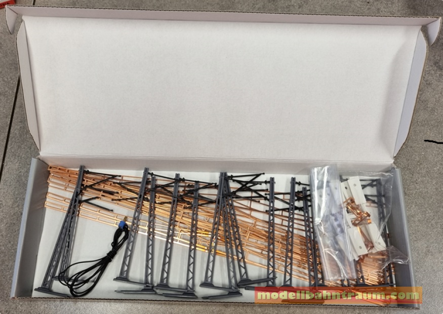 Inhalt: 15 Masten Nr. 650, 1 Anschlussmast Nr. 651, 14 Fahrdrähte Nr. 652, 19 Verbindungsstücke Nr. 653, 2 Ausgleichsstücke Nr. 656, 2 Weichen Nr. 658